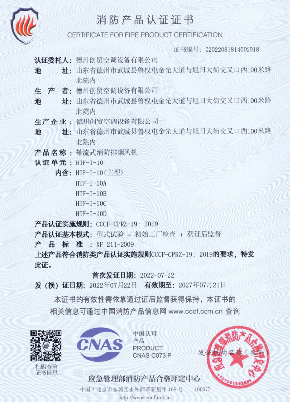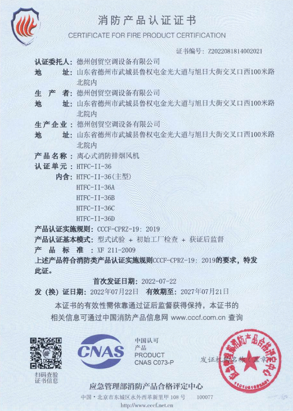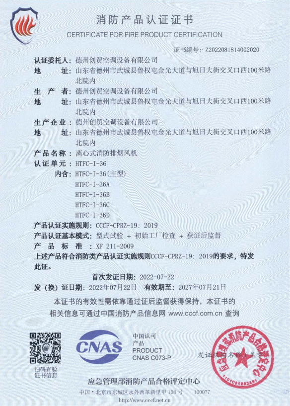德州創貿空調設備有限公司坐落于山東省德州市武城縣魯權屯鎮通風/空調設備產業園,注冊資金1000萬元,是以研發、生產、銷售、cccf消防排煙風機、閥門,中央空調通風系統產品為核心業務的現代化企業。 公司不斷升級生產設備,引進新型工藝及流程,產品各項檢測貫穿整個生產環節,產品在原材料采購、設計、制造、檢測、各個環節均嚴密受控,各個部件均嚴格按照國家標準以及行業標準。企業以市場為導向,聘請著名科研院校對我公司進行技術指導。售后服務以“快速、優質、滿意”為服務宗旨,逐漸形成全國范圍內的售后服務專線,滿足廣大客戶的需求! 公司真誠希望同社會各界朋友共同發展,合作共贏!
